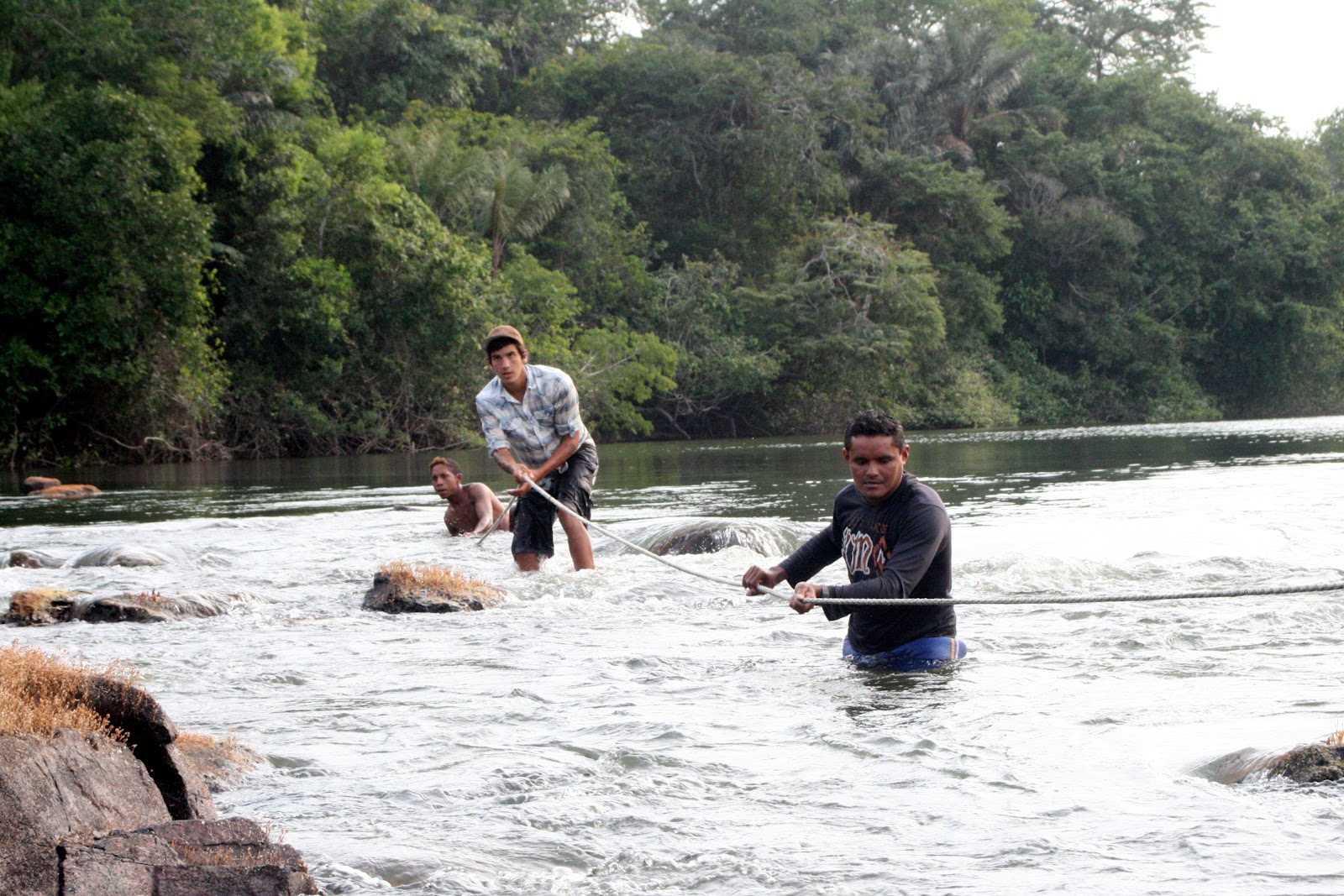 Palito drives, Pataca, Nathan and Clyde push to get it up the rapid.